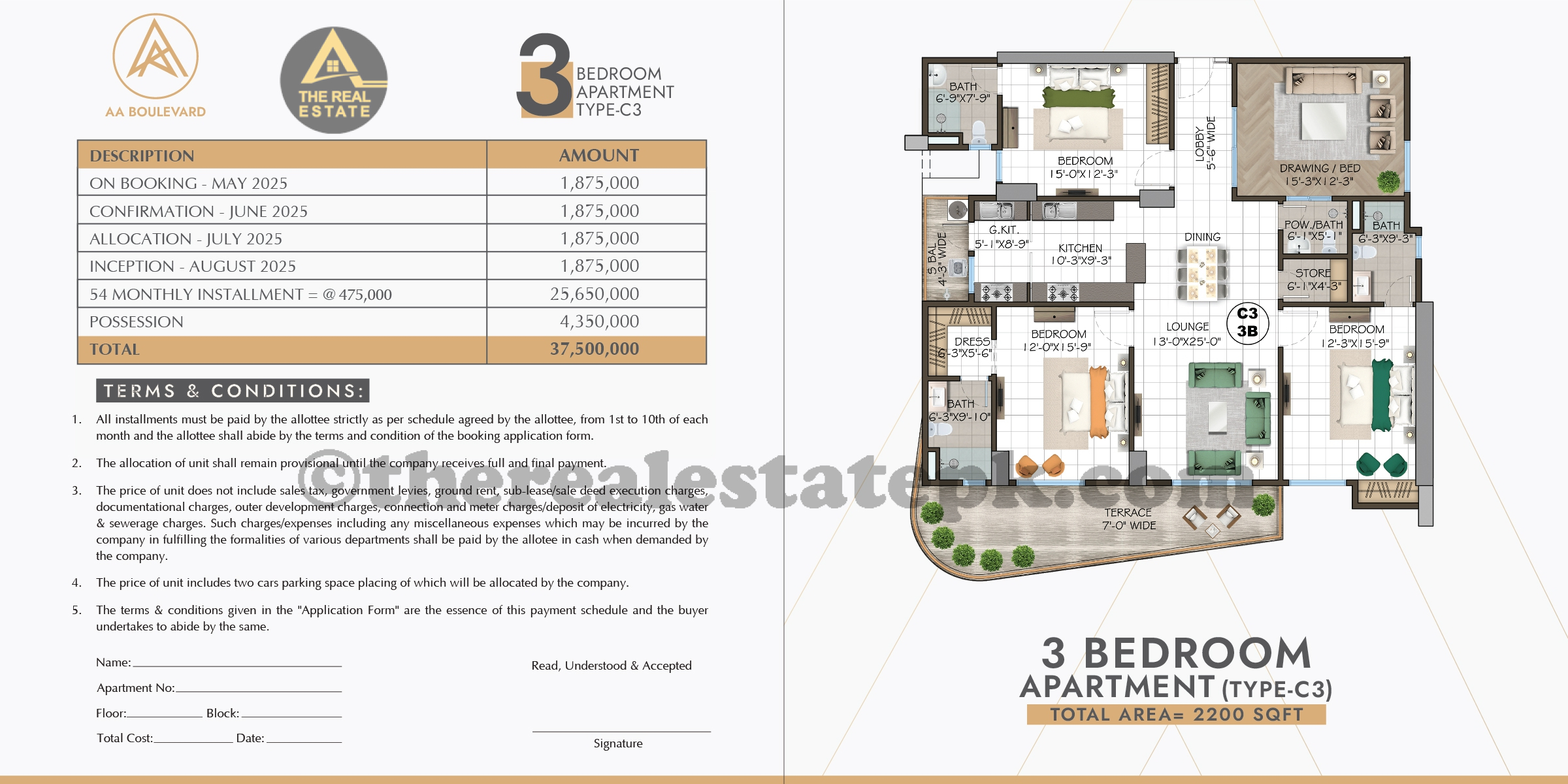 The price for a 3-bedroom apartment (Type C3, D1, or D2 โ€“ 2200 sqft) is PKR 37,500,000 with flexible 4-year payment plans.