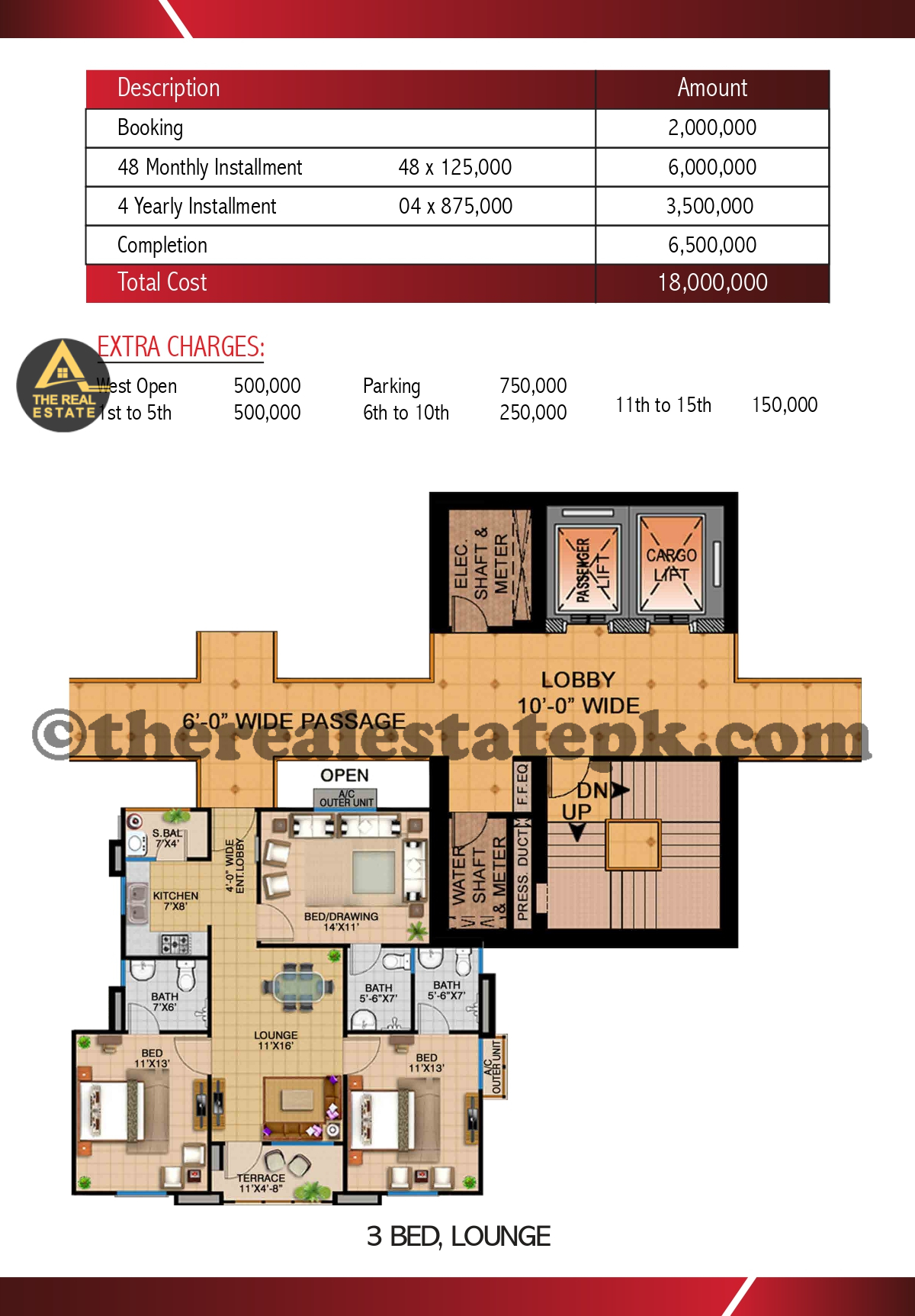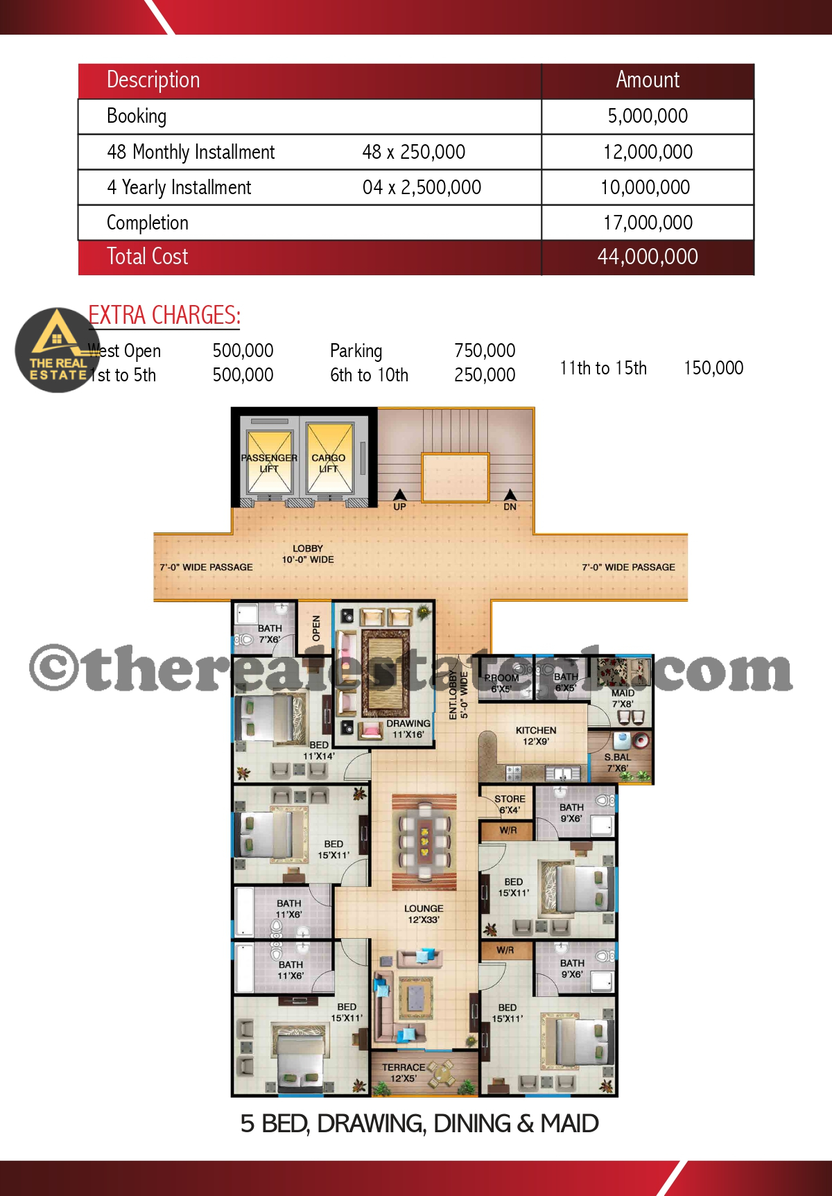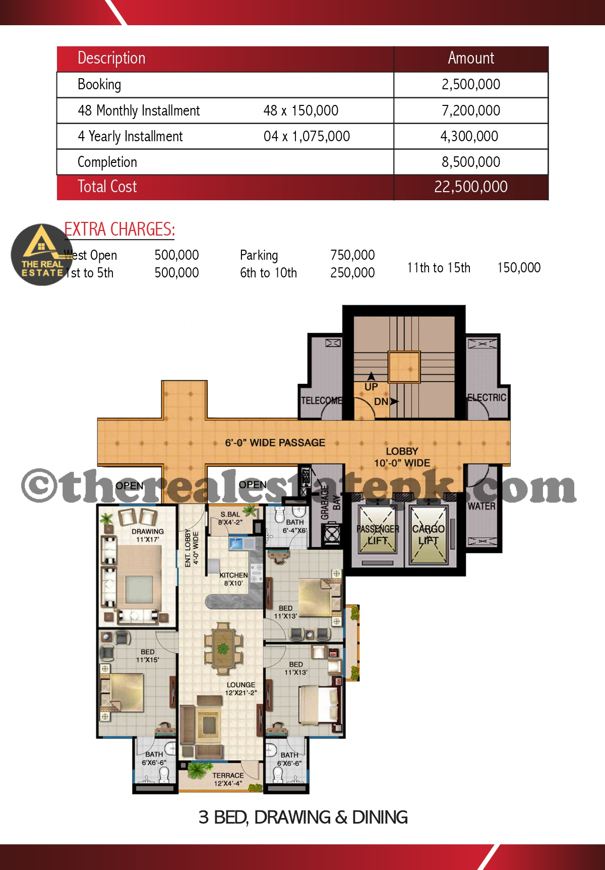 West Open: PKR 500,000 | Parking: PKR 750,000 | 1st to 5th Floor: PKR 500,000 | 6th to 10th Floor: PKR 250,000 | 11th to 15th Floor: PKR 150,000