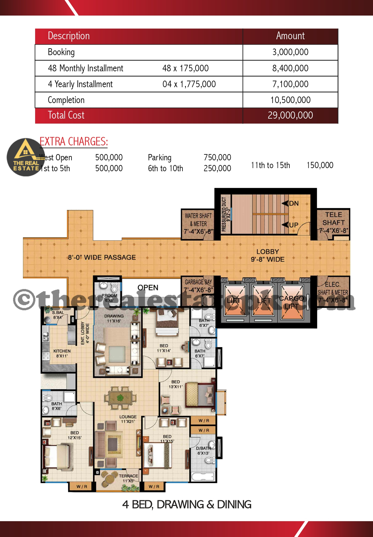 | 4-Room Apartment (3 Bed Drawing + Dine) | 1200 | 4 | 22,500,000 |